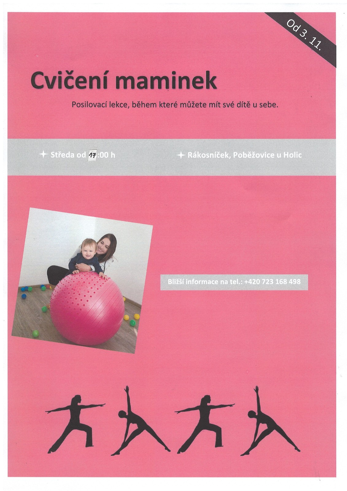 Terezka si pro vás připravila každou středu,začíná se 3.11., od 16 hodin cvičeni. Není to jen pro maminky, ale pro všechny ženy, dívky, možná i muže. Jako bonus pro maminky, kreré nemají hlídání, nebo chtějí mít ratolest u sebe, mohou přijít i s díťátkem. Buď bude zapojeno do cvičení nebo může využít herničku. Prijďte vyzkoušet a šiřte kolem sebe. (Viz.příloha)