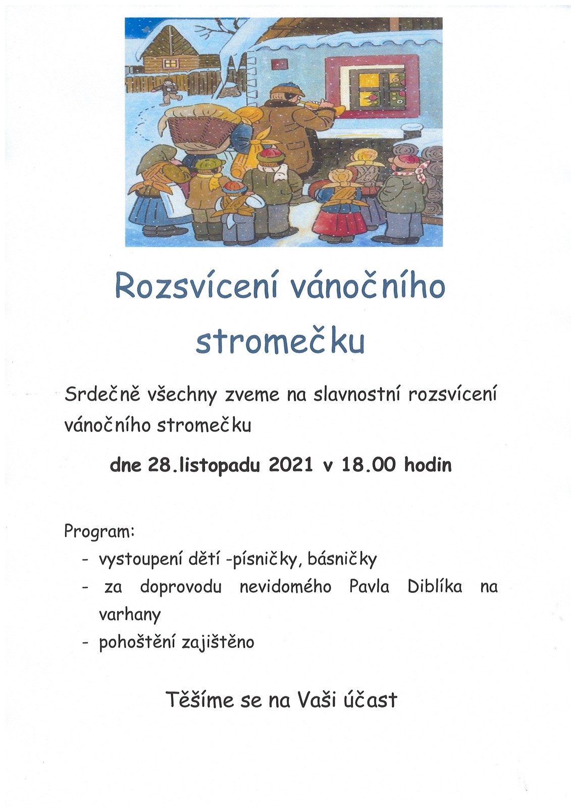 Srdečně zveme občany na slavnostní rozsvícení vánočního stromečku, které se koná 28.11.2021 v 18.00 hod.