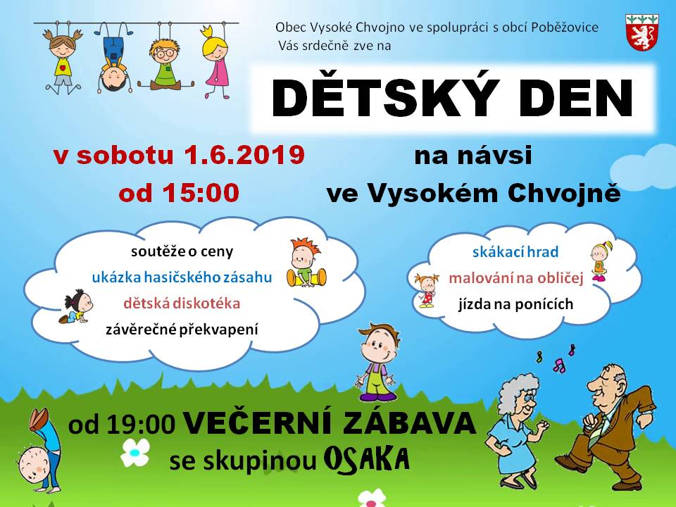 Ve spolupráci s obcí Vysoké Chvojno vás zveme na dětský den konaný dne 1.6.2019 v obci Vysoké Chvojno. (Pozvánka viz. níže)
