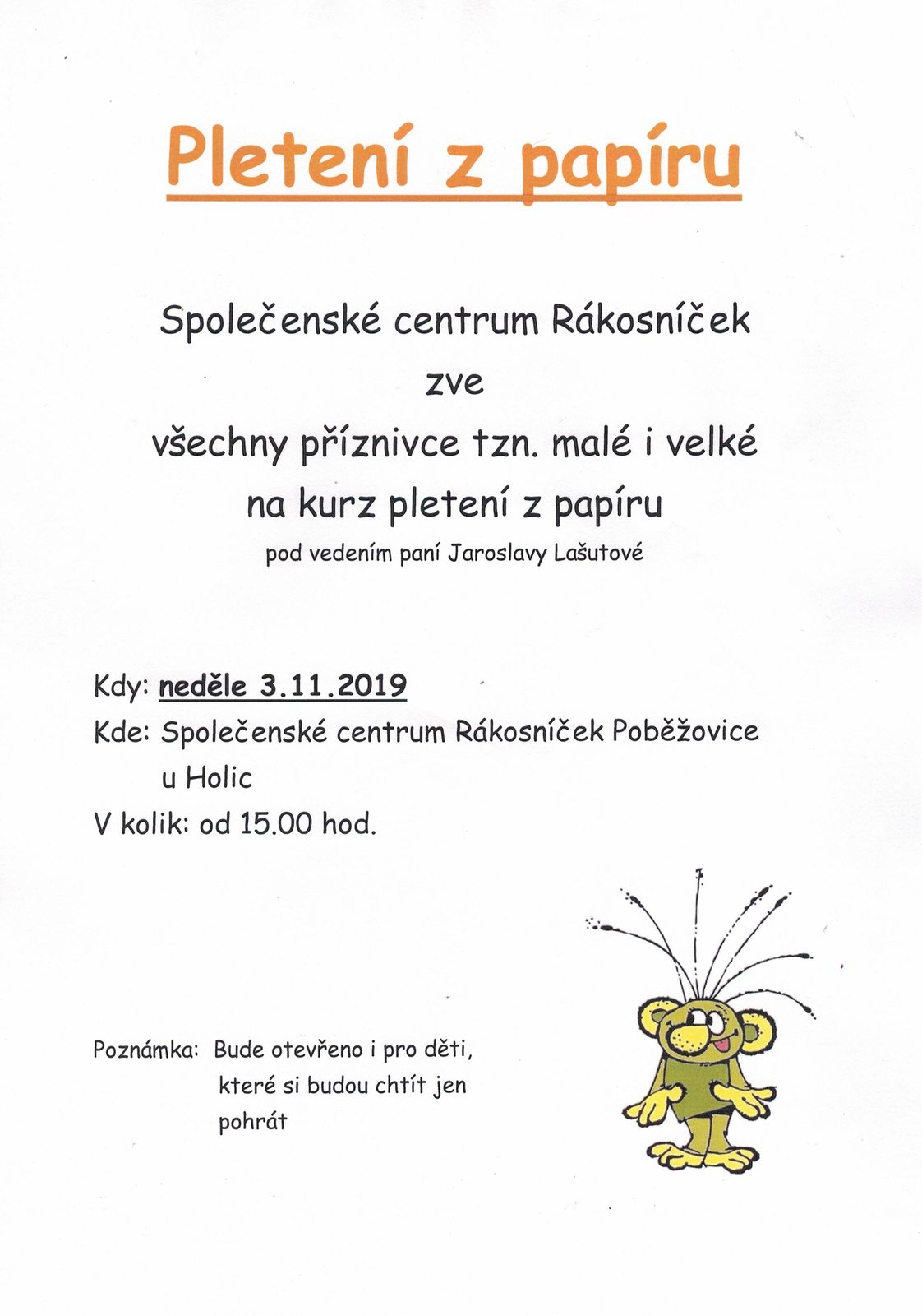 Obec Poběžovice u Holic zve děti i dospěláky do společenského centra Rákosníček na tvořivé odpoledne  -  pletení z papíru.
